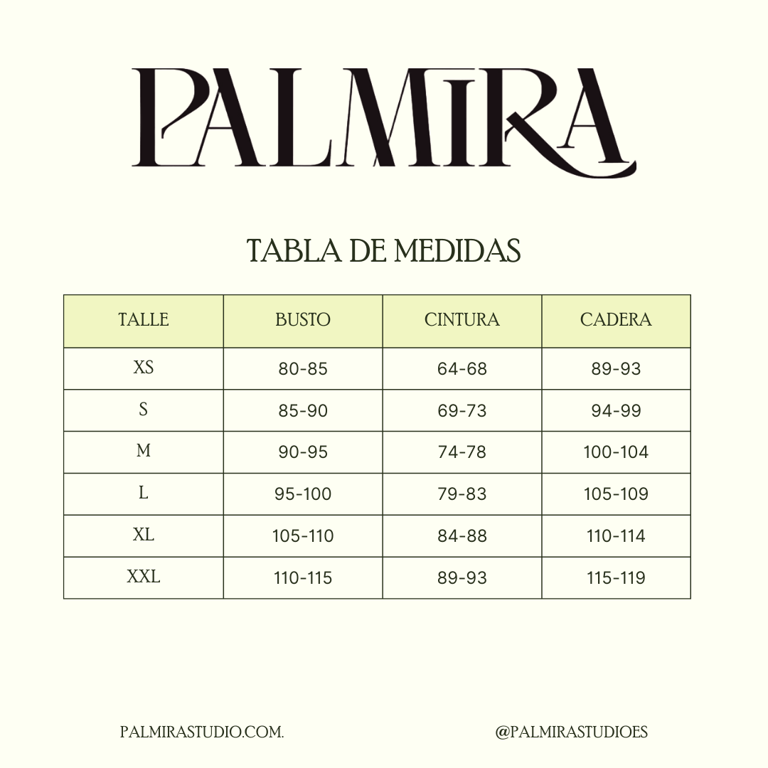 El verdadero lujo que ofrece Palmira comienza en la dedicacion, el tiempo y las manos que crean cada pieza, nuestro servicio a medida nace de creer que todas las mujeres merecen una prenda que abrace su figura, celebre sus curvas y que exprese su elegancia sin limites ni estándares impuestos, por lo que cada uno de nuestros modelos esta disponible en la medida que lo quieras realizar ofreciendo asesoramiento personalizado por nuestros canales de comunicación. Las prendas a medida se entregan dentro del periodo de 10 dias habiles segun disponibilidad y se cotizan especialmente adaptandose a tus medidas y a la ocasión de uso. Las prendas hechas a medida NO TIENEN CAMBIO.
